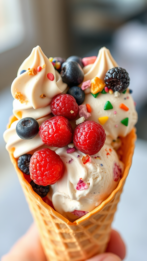 Decadent scoops of creamy ice cream nestled in a golden, half-moon waffle cone, adorned with a colorful medley of ripe berries and a sprinkle of whimsical toppings, creating a symphony of flavors and textures.