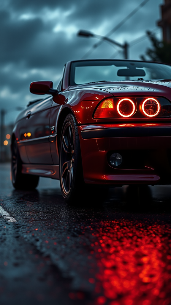 Deep crimson BMW E39 M5 convertible with glowing halo headlights, capturing a cinematic essence and hyper-realistic detail, set in an 8k resolution with a backdrop of a shadowy dusk sky, slight drizzle enhancing the sleek, polished finish, reflections glistening on wet asphalt, hints of urban lights reflecting off the bodywork, creating an atmosphere of luxury and mystery.