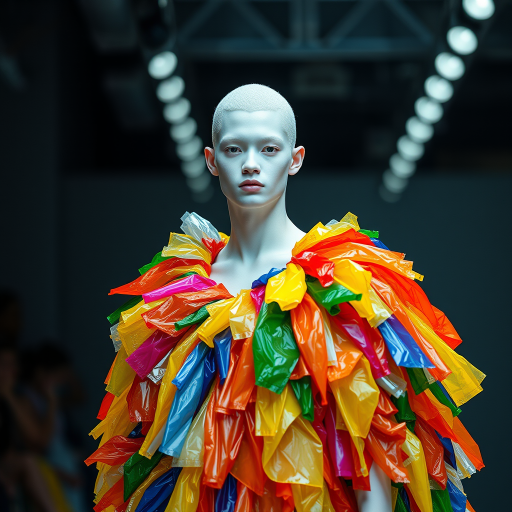 Defying fashion norms with courage and inclusivity, this striking albino male model captivates in a remarkable dress crafted from vibrant plastic bags. A celebration of personal flair and limitless style, showcasing the diverse allure of fashion's beauty.