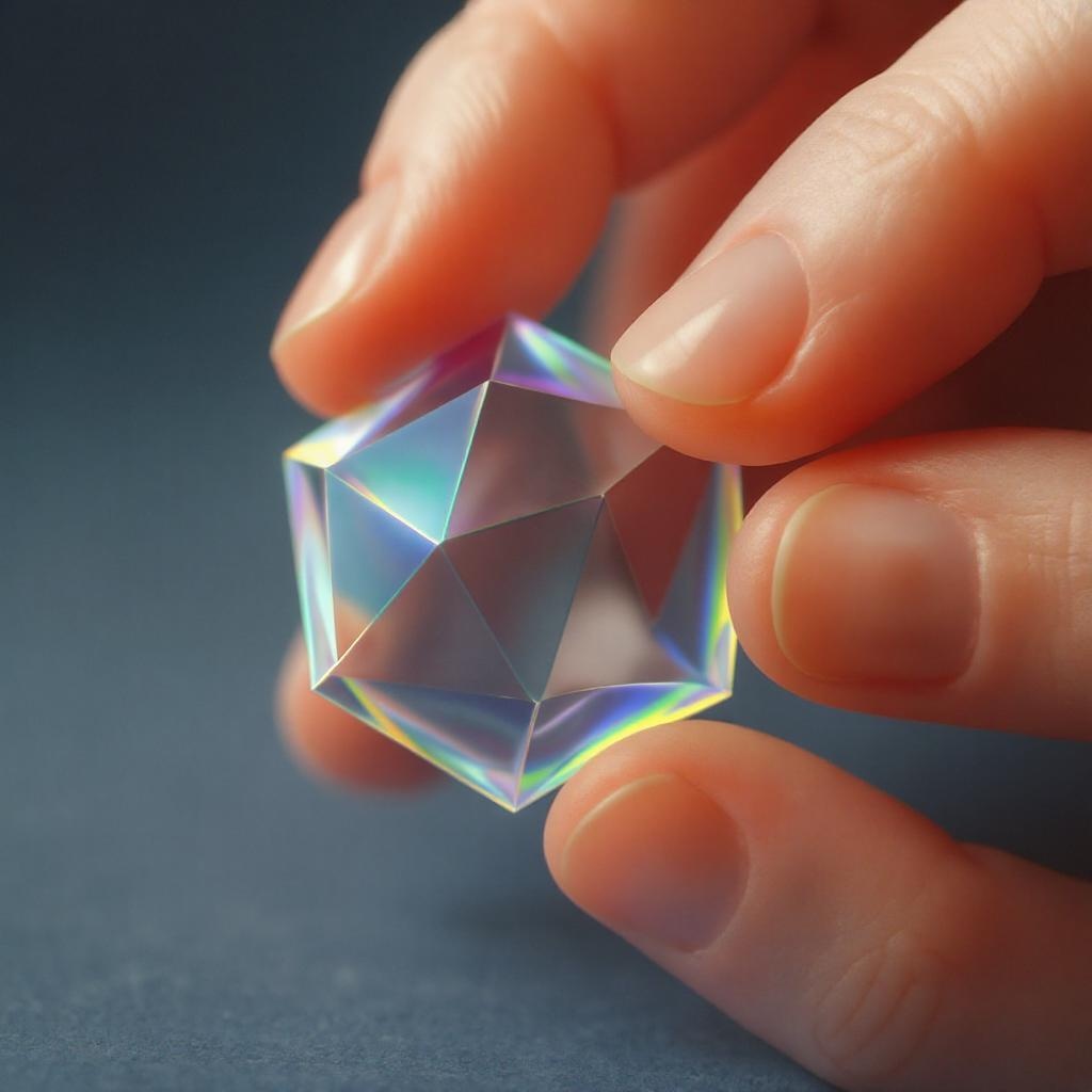Delicate fingers nervously fidget with a transparent geometric shape, its crystalline edges reflecting light in prismatic hues, captured in stunning clarity and vivid detail.