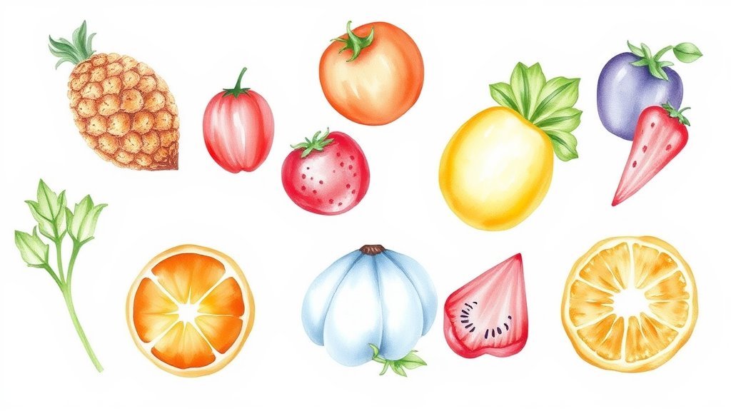 Delicate watercolor illustrations of assorted foods, individually placed on a plain white background with softened edges, showcasing vibrant colors and fine details, avoiding any shadows. Fresh and appetizing visual aesthetic.