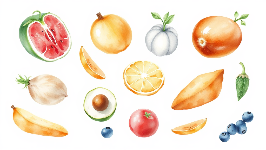 Delicate watercolor illustrations of various foods, set against a pristine white background, featuring vibrant colors and fine details, captured with a bright and airy aesthetic.