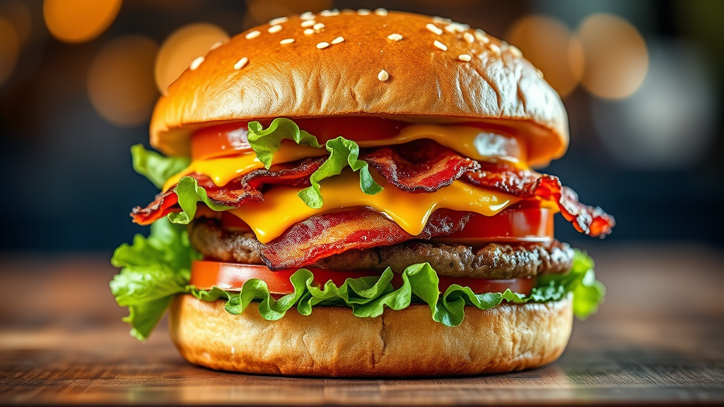 Delicious gourmet burger featuring crispy bacon, fresh lettuce, ripe tomato, and melted cheddar cheese| enticing promotional visual| ultra high-definition product photography| vibrant full-color display| highly detailed render| irresistibly appetizing image.