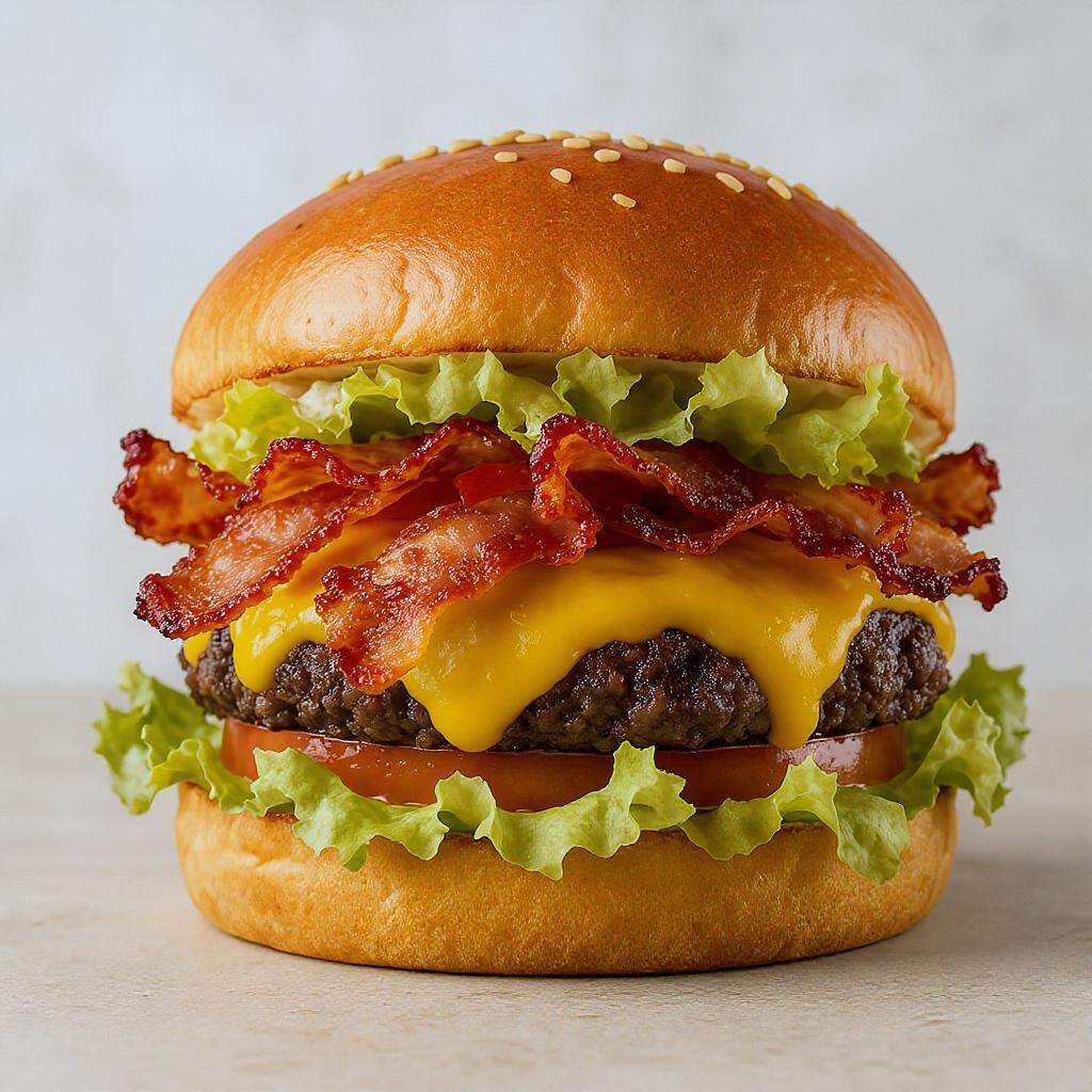 Delicious gourmet burger with crispy bacon, fresh lettuce, juicy tomato, and melted cheese| enticing promotional image| high-definition product photography| vibrant full-color| ultra-realistic render| tantalizing and appetizing.
