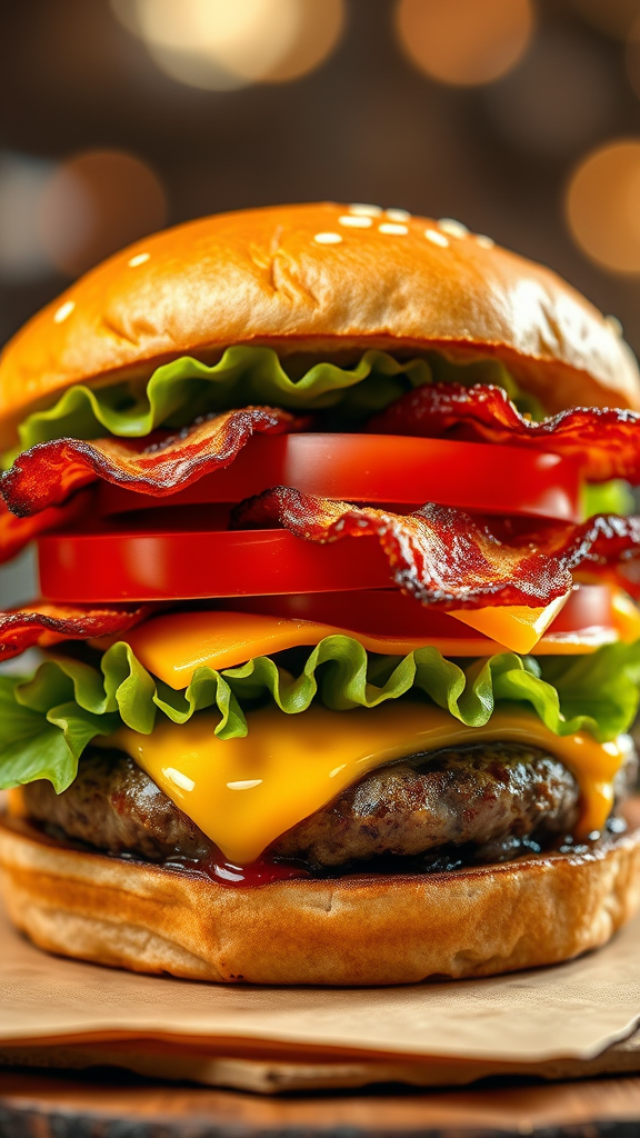 Delicious gourmet hamburger topped with crispy bacon, fresh lettuce, ripe tomato, and melted cheese; enticing promotional image; high-definition product shot; vibrant full-color palette; ultra-realistic render; irresistibly appetizing.