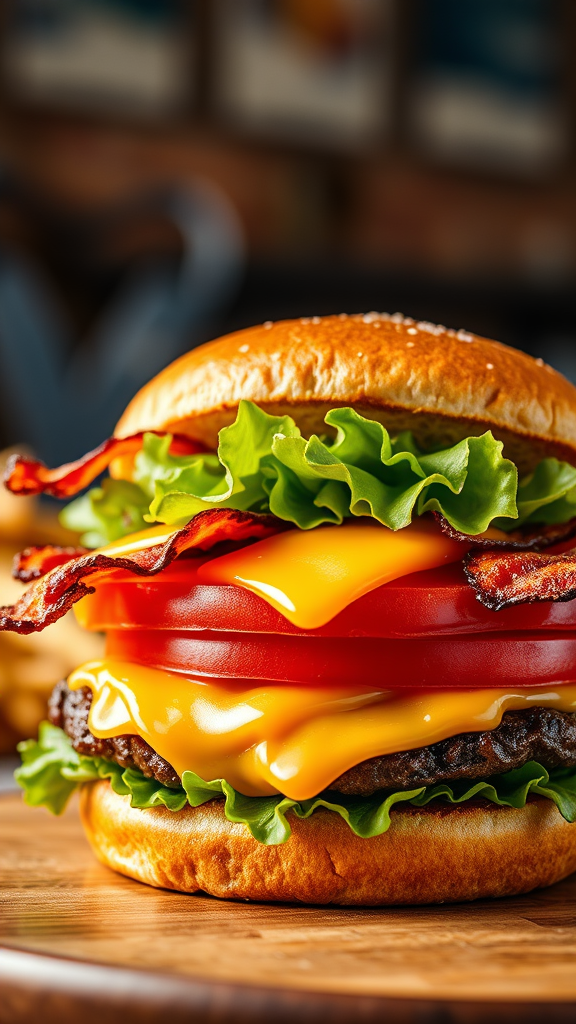 Delicious hamburger loaded with crispy bacon, fresh lettuce, ripe tomato, and melted cheese; captivating promotional image showcasing high-quality product photography; vibrant full-color palette with impressive rendering; irresistible and appetizing visual allure --v 5.