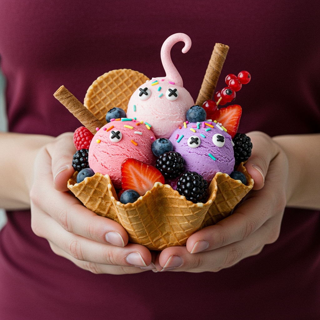 Delicious and vibrant ice cream sundae nestled in a crisp waffle cone bowl, adorned with fresh berries and an array of delightful toppings. The scene is captured in ultra-high definition, bursting with rich colors and details, providing an exceptional viewing experience. Twists of whimsicality play with surreal elements, where scoops possess an imaginative flair showcasing playful characteristics like cross-eyed sprinkles and elongated neck-like swirls. The hands hold the creation with unexpected playful fingers. Although some aspects surprise with cloned scoops and humorous asymmetry, the scene maintains its captivating, dreamlike quality without any background distractions or distortions, immersing you in the tantalizingly fantastical treat.