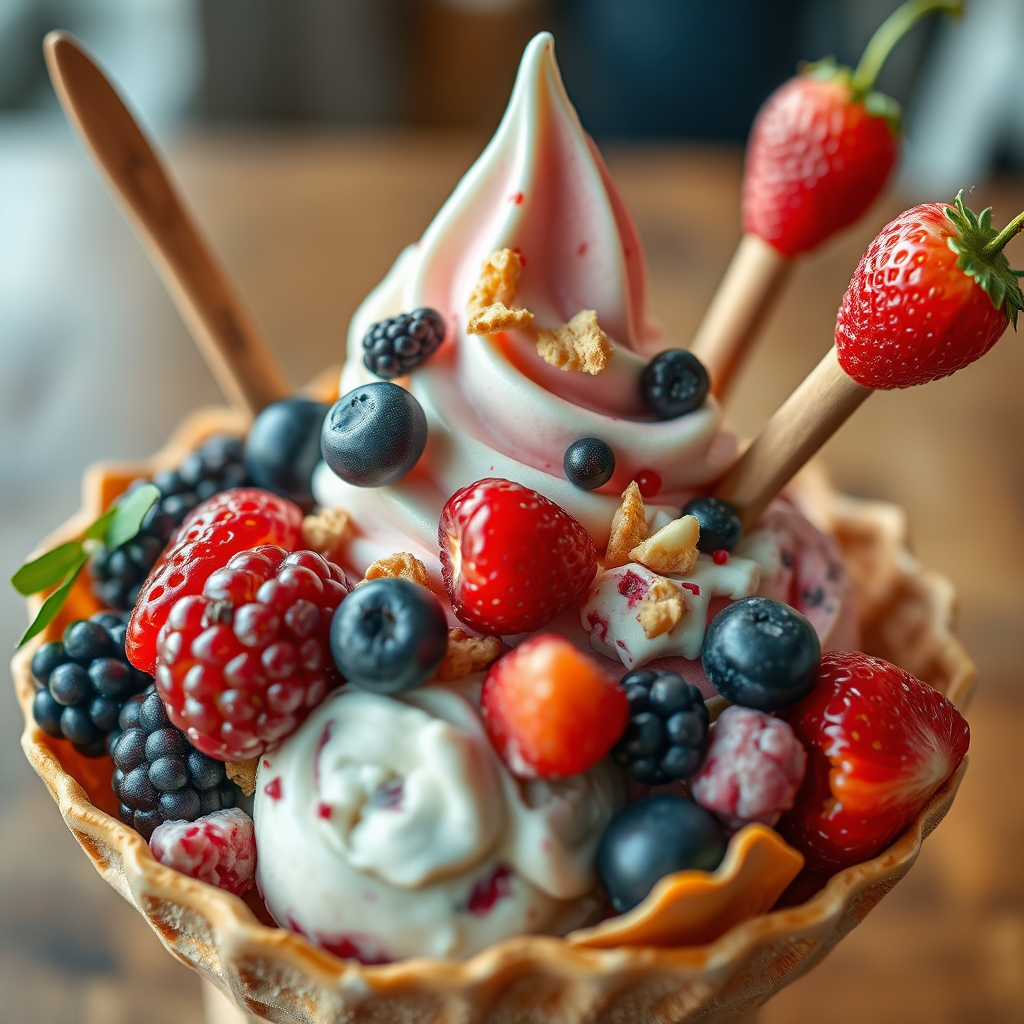 Delicious ice cream sundae nestled in a waffle cone bowl, adorned with an array of fresh berries and an assortment of toppings, captured in UHD, HDR10, 16K resolution; an imaginative depiction featuring cloned elements, playful distortions, quirky features like elongated necks and additional fingers, evoking a surreal, dreamlike quality. The imagery is detailed yet abstract, combining both high resolution and artistic imperfections such as out-of-frame elements, slight blurs, and subtle texture anomalies that create an intriguing, whimsical composition.