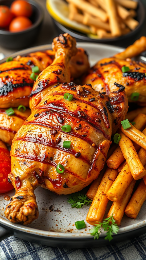 Deliciously grilled chicken, culinary photography, artistic food arrangement, expansive composition, 85 mm lens, f 11 aperture, professional studio shoot, hyper-detailed capture, photorealistic rendering, high resolution, inspired by octane render quality, 8k detail sharpness, --q 2 --s 1000 --ar 2:3, subtle creative nuances enhancing visual appeal.