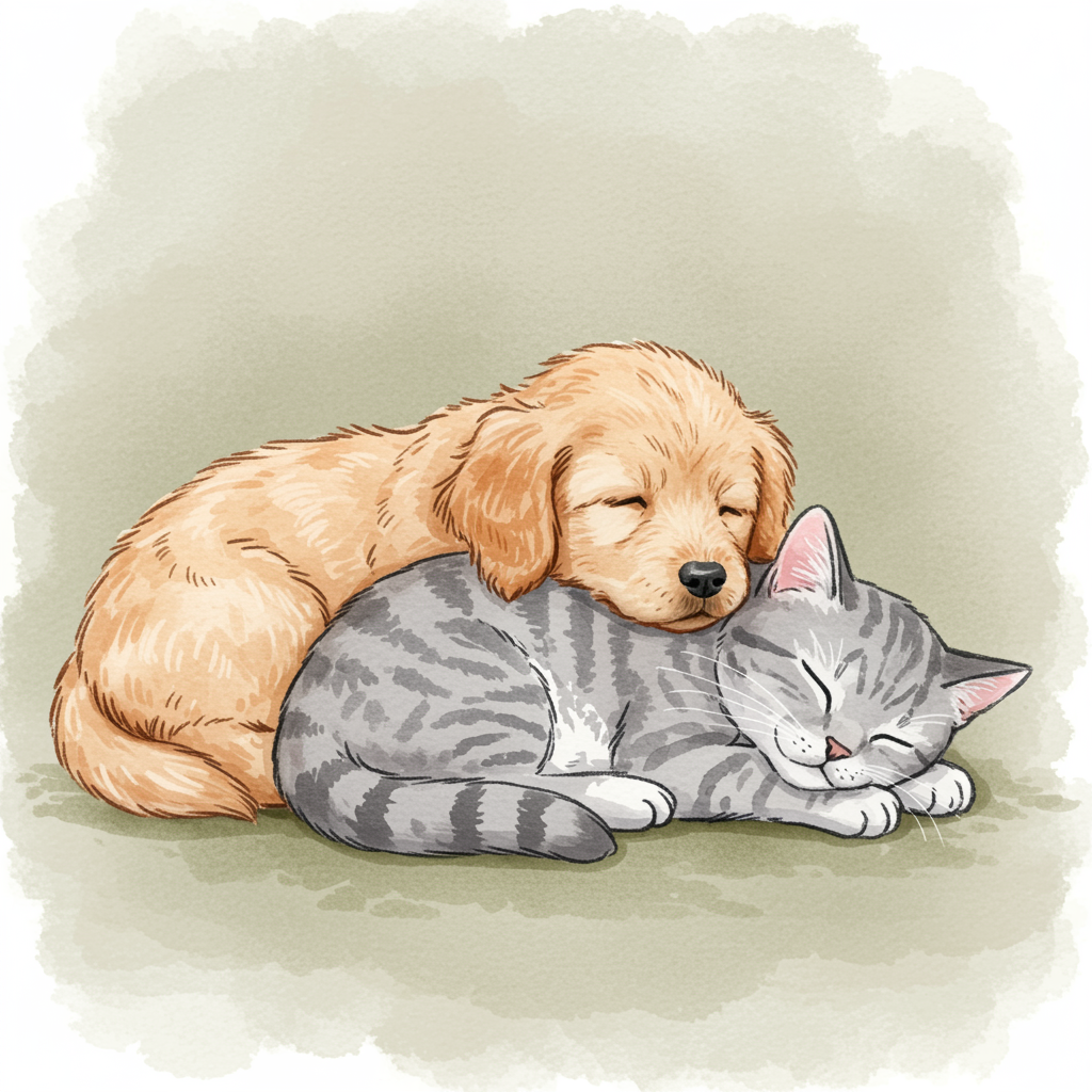 Delightful illustration of cute pets napping peacefully, evoking a sense of tranquility and mindfulness, watercolor style with soft pastel hues and a soothing khaki-toned backdrop.