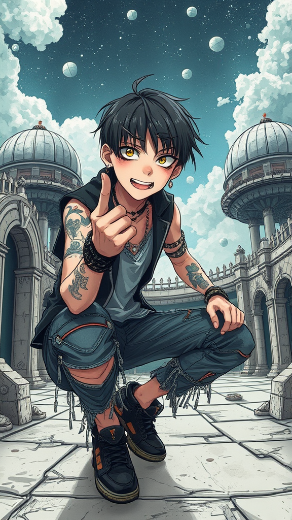 Delinquent street punk wearing emo-style clothing, gives a rebellious middle finger to the viewer, one boy, bob cut hairstyle, tongue playfully out, mouth closed, squatting position, torn and rugged clothes, adorned with piercings, jewelry, and tattoos, set against the backdrop of a grand observatory with intricate and finely detailed surroundings, surreal and absurdly high resolution imagery, top-tier 3D quality, blending cartoon and anime styles with sketch-like elements.