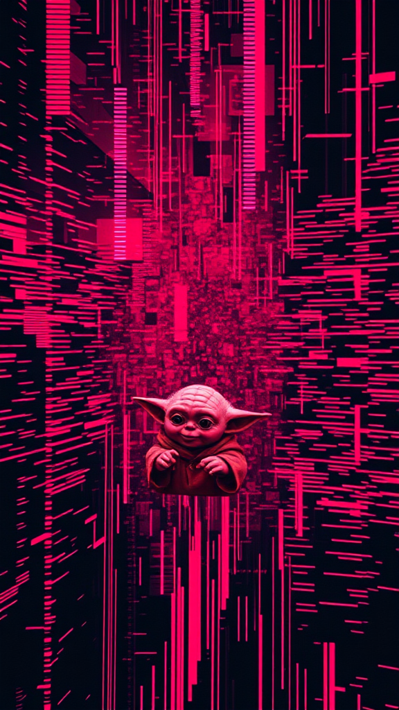 Delve into a realm of intense digital distortion where glitch art aesthetics dominate, featuring oversaturated hues of red and purple. Experience a chaotic fusion of corrupted data visualization and pixelation artifacts, interwoven with analog interference patterns and chromatic aberrations. Immerse in the nostalgic disruption of VHS distortion and embrace the allure of digital decay, intertwined with wavelike interference patterns. Among the chaos, catch a subtle glimpse of our beloved, enigmatic Baby Yoda.