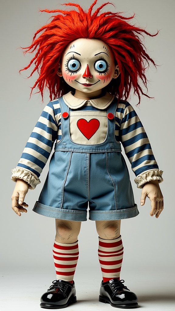 Demented, psychotic, raging human-sized Raggedy Ann. She is a refugee from Toyland. Tall, strong, athletic, bouncy. Bright red yarn hair, wild and untamed. Canvas cloth skin. Blue almost-human glass eyes. Orange triangle nose, bright red smiling mouth. Long sleeved pullover shirt with blue and white horizontal stripes, a big red heart on the front of the shirt. Soft-blue pleated miniskirt with matching leg warmers. Red and white stockings with horizontal stripes. Black patent-leather shoes. Full body pose,