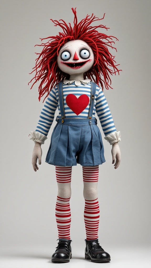 Demented, psychotic, raging human-sized Raggedy Ann. She is a refugee from Toyland. Tall, strong, athletic, bouncy. Bright red yarn hair, wild and untamed. Canvas cloth skin. Blue almost-human glass eyes. Orange triangle nose, bright red smiling mouth. Long sleeved pullover shirt with blue and white horizontal stripes, a big red heart on the front of the shirt. Soft-blue pleated miniskirt with matching leg warmers. Red and white stockings with horizontal stripes. Black patent-leather shoes. Full body pose,