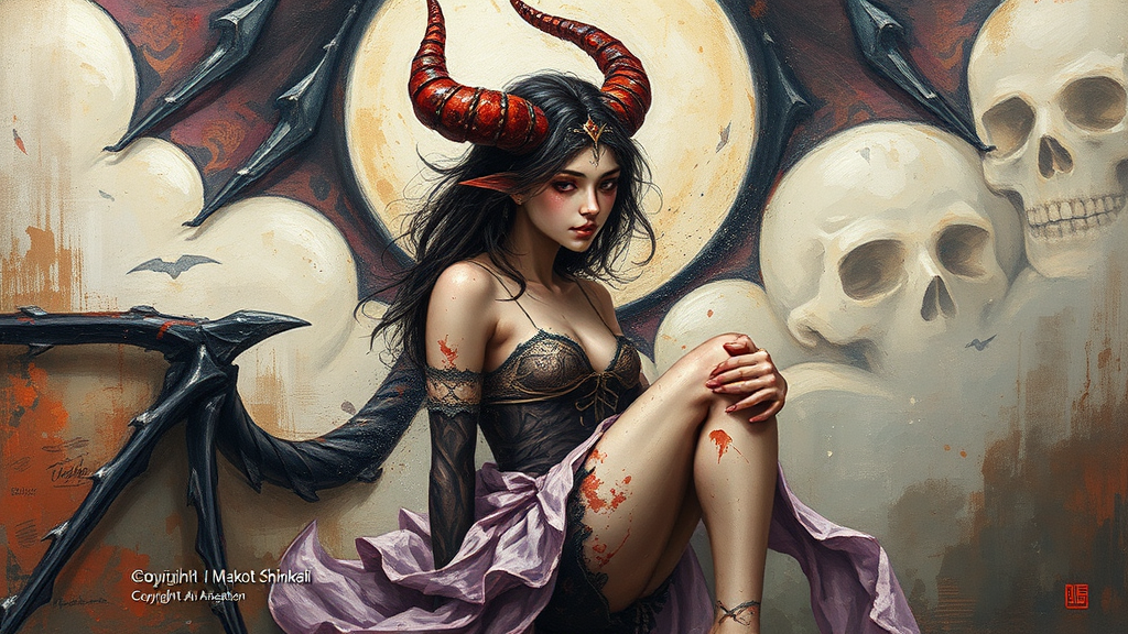 Demon princess, depicted in a classical oil painting style, filled with fantasy elements, captivating the imagination of art enthusiasts on ArtStation. The artwork showcases expressive brush strokes, rich oil textures, and a textured canvas, drawing inspiration from the distinctive styles of Kawacy and Makoto Shinkai. The painting is embedded with the artist's subtle text and watermark, accompanied by the meticulously placed copyright and artist names.