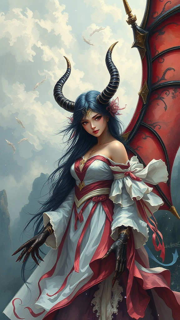 Demon princess in a classical oil painting style, infused with fantasy elements, featuring dynamic brush strokes on canvas, echoing the artistic flair of Kawacy and Makoto Shinkai. The background showcases an ethereal realm with fantastical landscapes. The composition captures a sense of mystique and elegance, resonating with the trending aesthetics on ArtStation. The artwork includes subtle texturing and color gradients, indicative of a masterful play with oils. The canvas exudes a timeless allure, while small, delicate details highlight the charming yet formidable nature of the demon princess. The piece is signed with an artist's signature, subtly blended into the background, preserving the integrity of the composition.