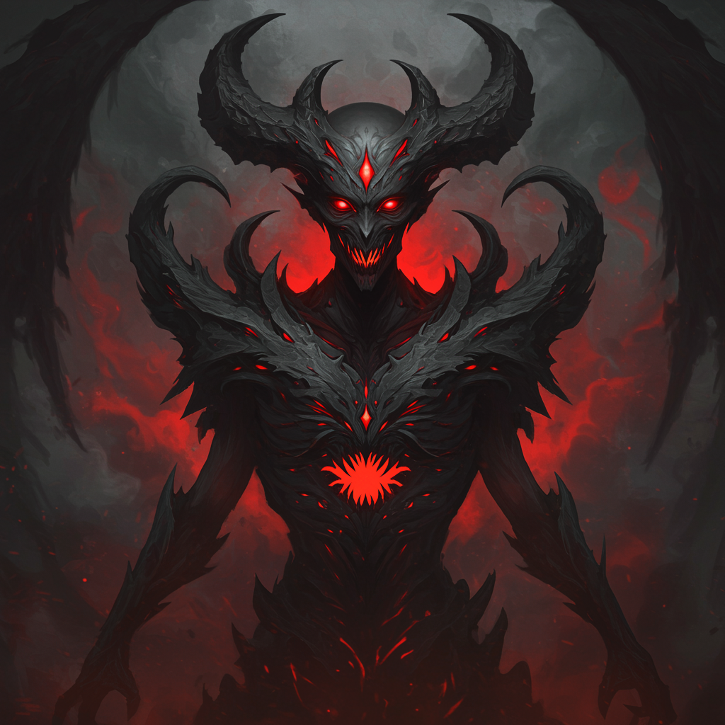 View this AI-generated image featuring an illustration of a sinister demon with glowing red eyes inspired by the styles of jessica rossier and brandon woelfel featuring a powerful use of negative space the demon s form is intertwined with dragon like elements bathed in dark gray and red hues set wit