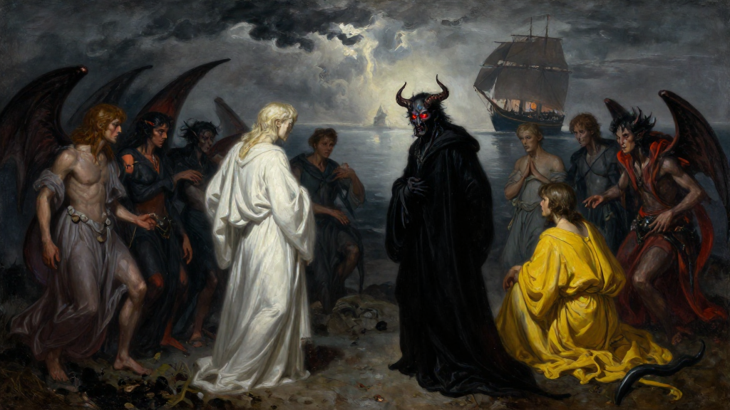 Oil painting of a demonic council gathered on a rocky, misty shoreline at night. A central demon with glowing red eyes and horns, robed in black, addresses a diverse crowd of humans and winged demons. One human in white robes stands prominently, while another in yellow robes sits. In the background, a large sailing ship is visible on the dark, reflective water under a glowing, stormy sky. The scene is dramatic and moody, with high contrast lighting, emphasizing the central figure. Dark, muted colors with highlights of red, yellow, and white, creating a sense of foreboding and mystery. Inspired by classical dark fantasy art.