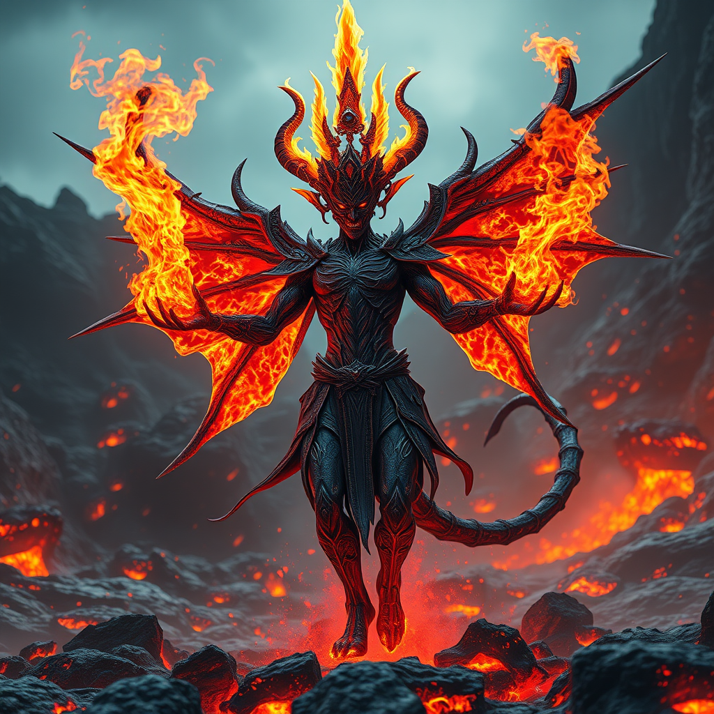 Demonic deity adorned with a crown of flames, wielding fire magic from their hands while striding through molten lava. Masterpiece artistry, exceptional quality, CG creation, perfect for wallpaper with HDR elegance. Captivating cinematic details and ultra-high definition 8k resolution bring this hyperrealistic vision to life. Showcasing the best of ArtStation HQ, realized through Unreal Engine and rendered with Octane's precision in 4k. Every feature exquisitely detailed, ensuring a breathtaking visual experience.