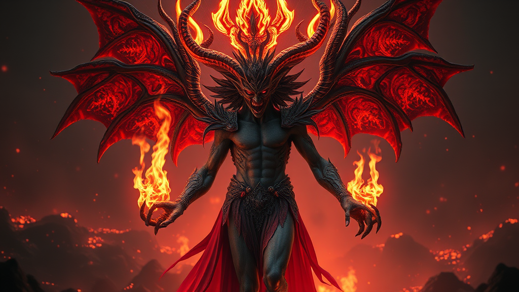 Demonic deity, infernal crown, flames flickering from fingertips, striding across molten lava, masterpiece, elite quality, CG, stunning wallpaper, HDR, supreme clarity, ultra-refined face, cinematic flair, intricately detailed, 8k resolution, raw, high art, artstation level HQ, powered by unreal engine, rendered with octane, 4k resolution, hyperrealistic, exceptionally detailed, ethereal, vibrant, oversaturated, textured, dynamic, immaculate anatomy, cohesive form, seamless composition, artful, polished, lifelike, immersed in fiery glow, divine, surreal, harmonious visuals, transcendent, mythic allure.