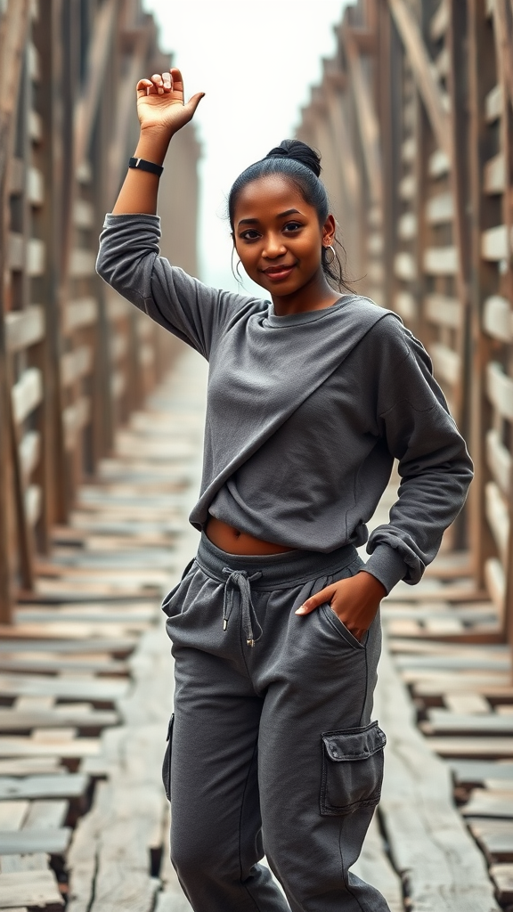 Depict a deconstructivist fashion image of a 24-year-old Cree-Kanak female playful dancer with an expression of victorious elation. Her physique showcases prominent, smooth collarbones transitioning into defined shoulders, toned muscles, and abs. She possesses a small bust, giving her a flat-chested appearance. Her deep, rich brown skin with cool undertones is visibly even and smooth, with skin pores and texture in sharp focus. She has thin crescent eyes, calm muted green in color, accentuated by long, graceful eyelashes. Her eyebrows are mini-arched, enhancing her delicate facial features. She wears an overly large asymmetrical sweatshirt revealing her midriff, paired with paneled harem pants featuring abstract cuts. Her hands rest casually in her pockets, her face adorned with a slight smile. The composition follows the rule of thirds, with a background of disjointed wooden planks forming a unique pathway, inspired by the style of H. R. Giger. Small creative modifications add a touch of uniqueness to the core concept.