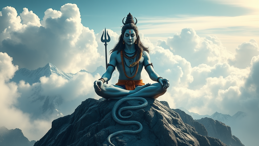 Depict the Hindu deity Shiva seated in deep meditation atop a mountain, exuding a majestic aura. Show him with an ethereal presence, his divinity radiating an otherworldly glow. Envelop him in billowing clouds and rugged, snow-capped peaks, underscoring the tranquil yet powerful atmosphere. Capture the essence of Shiva's divine energy and might, embodying his role as the cosmic force's master. A snake coils gracefully around his neck, symbolizing his dominion over nature. This image should inspire reverence and awe, portraying Shiva as the supreme deity reigning over the mountain's sacred landscape.
