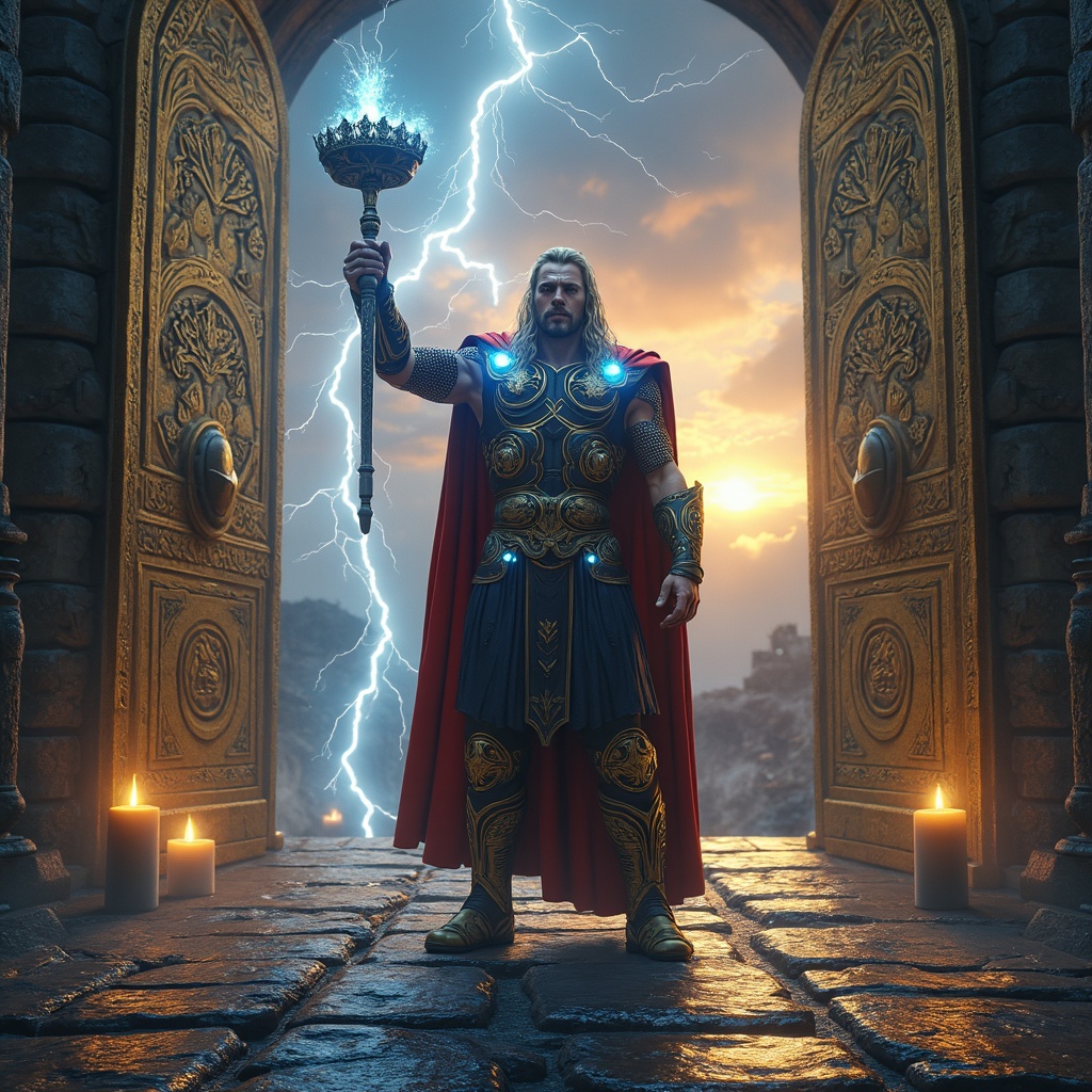 A hyper-realistic depiction of Thor, the God of Thunder, featuring intricately designed symbolic armor with Nordic runes, holding Mjölnir aloft as arcs of lightning dance around him. He stands at the grand entrance of Valhalla, with majestic golden doors inscribed with celestial patterns. His eyes glow with a powerful blue energy, reflecting his divine strength and wisdom. The atmosphere is charged with electricity, casting dynamic shadows on the ancient stone pathways, set against an epic sunset sky that hints at otherworldly realms. The scene captures the awe-inspiring presence of a god ready for battle, surrounded by the whispered legends of heroes past.