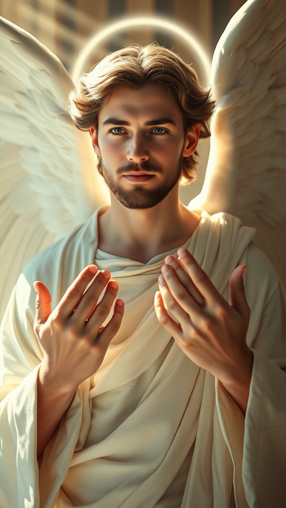 A striking depiction of Angel Gabriel in his heavenly form, the portrait showcasing his immaculate complexion and intricate details, dressed in traditional archangel attire, with hands of perfection, set in an atmosphere that exudes tranquility and deep spirituality, the light creating a divine radiance around him, reminiscent of a high-definition photograph, captured with a Sony Alpha 1 camera, using a 85mm lens, f/1.4 aperture, a shutter speed of 1/500, and ISO 100 settings, the resultant image being in 8K UHD, highlighted by a palette of soft and neutral tones, small creative changes adeptly enhancing the initial concept.