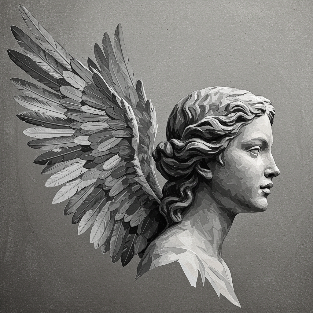 A detailed and surreal depiction of an angel's head, featuring wings crafted from a paper collage in various monochrome greys. The background showcases a textured surface that enhances the depth of the piece. The illustration displays gentle, flowing edges and delicate lighting effects to create a sense of depth. Created using abstract digital art techniques, the artwork maintains a raw, expressive style with subtle imaginative alterations to evoke a dreamlike atmosphere.