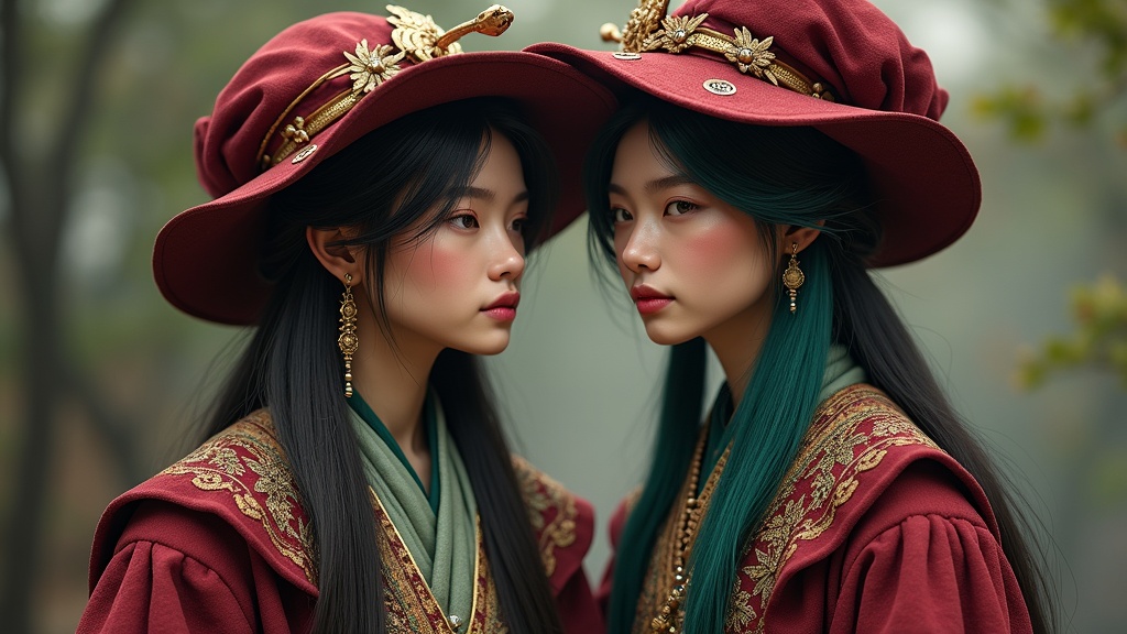 View this AI-generated image featuring a realistic depiction of two individuals adorned in intricate cloth hats and flowing robes their attire reminiscent of vibrant maroon and emerald hues evoking the grace of avian creatures their expressions hint at charming personalities as though they belong in