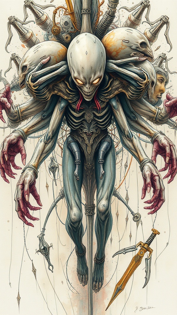 View this AI-generated image featuring a surreal and intricate depiction inspired by squall lionhart from final fantasy viii blending elements of watercolor and h r giger s influence featuring a fantastical creature with multiple heads arms and legs the figure displays a mesmerizing distortion with