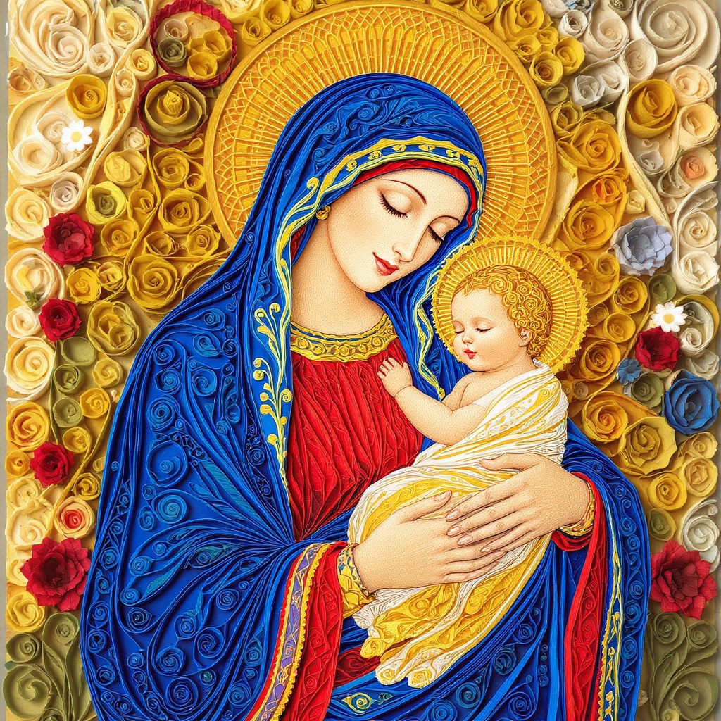 A vibrant depiction of the Virgin Mary cradling baby Jesus crafted through intricate paper quilling, where swirling patterns and lively colors bring the scene to life with a sense of warmth and serenity. Mary is adorned in a flowing robe of cobalt blue and deep crimson, while delicate golden curls frame her serene face. Baby Jesus, wrapped in soft hues of cream and light gold, gently nestles in her arms. The background bursts with a symphony of colors, reflecting the aura of divine love and tenderness.