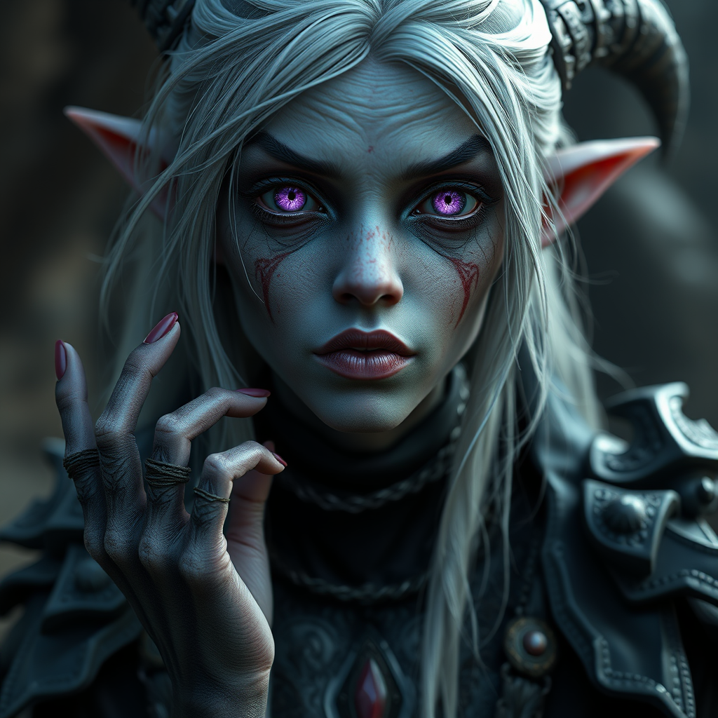 depiction of a female drow in a dnd setting, resembling a young Ann Miller with purple eyes, showcasing extreme detail and realism. Shot using unreal engine and octane for a full-body, zoomed-out capture with a 70mm lens, resulting in a photo-realistic image of 16k UHD HDR quality. The scene presents an intriguing mix of fantasy elements and slight imperfections: a long neck, extra fingers, and a slightly altered facial structure, maintaining a sense of mystery and fantasy. Avoid common digital distractions like low resolution, blurriness, and graphic obstructions.