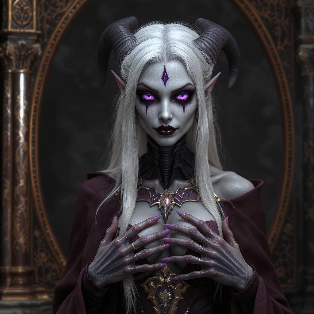 Depiction of a female drow, influenced by the elegance of a young Ann Miller, with striking purple eyes and full-bodied representation. Drawing from Dungeons & Dragons aesthetics, the scene is crafted in a hyper-realistic style using advanced rendering techniques akin to Unreal Engine and Octane. Set against a 70mm frame, the image captures ultra-high-definition details in 16k, featuring vibrant HDR imagery. The character exhibits subtle mutations, presenting an elongated neck and an unusual number of fingers, hinting at her unique origins. Her countenance is clone-like, yet distinctly cross-eyed, adding an element of intrigue. Exquisite attention to detail enhances her ethereal beauty, ensuring no low-resolution artifacts or distractions such as logos or watermarks appear. The focus is on the seamless blend of fantasy and realism, avoiding cropped or split imagery, creating a cohesive and immersive visual narrative.