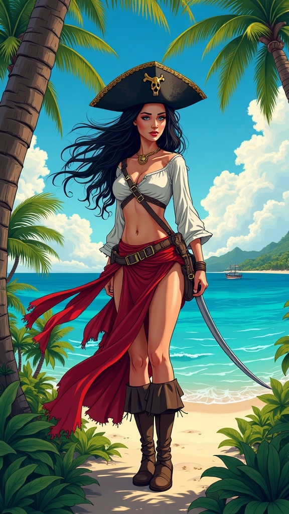 View this AI-generated image featuring a stunning depiction of a female pirate set against a tropical island backdrop capturing her in a dynamic pose at the center of the scene the visual is marked by intricate details and breathtaking beauty featuring precise linework and vibrant colors the composi