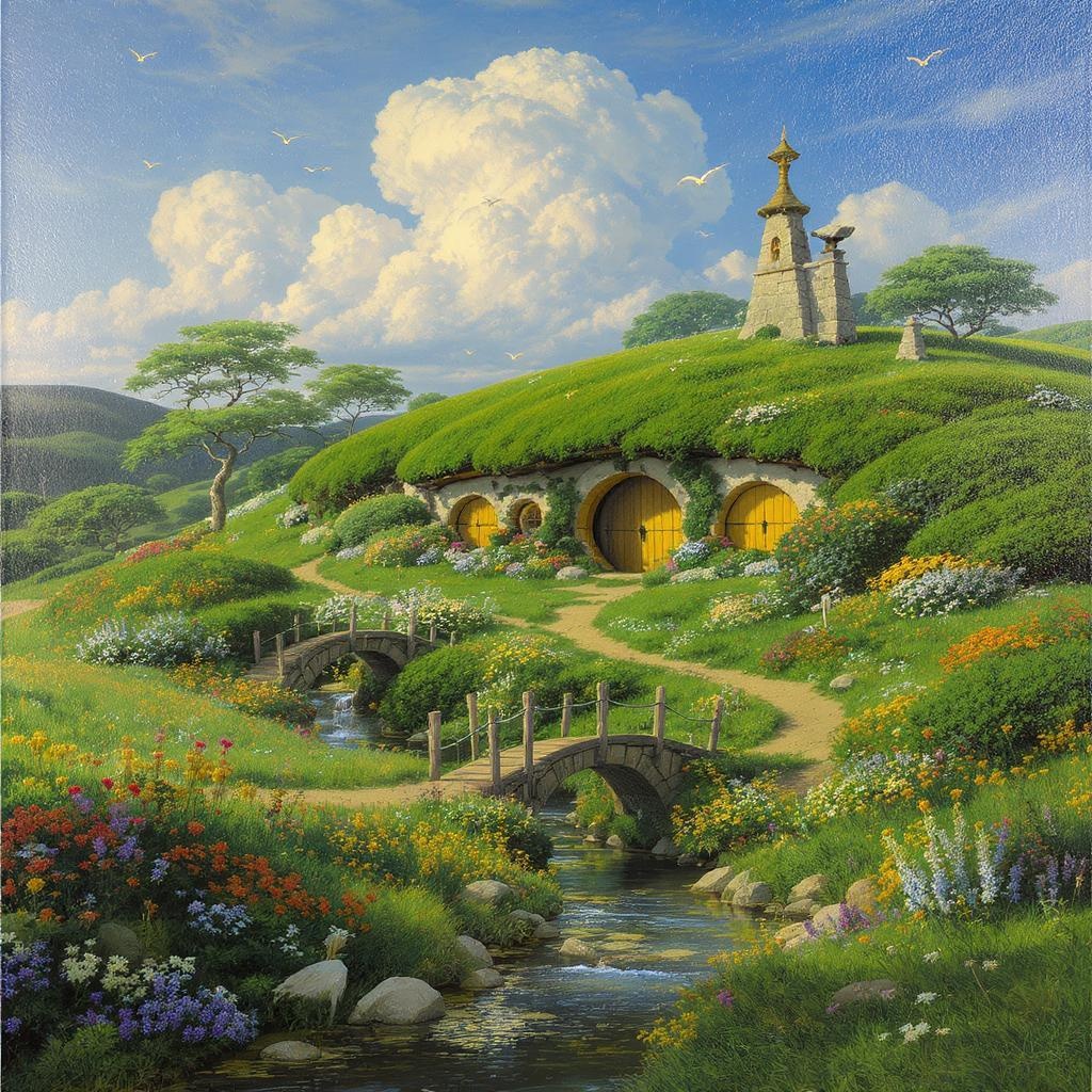 A serene and beautiful depiction of a hobbit's shire, rendered as a full-body artwork in a professional majestic oil painting style, inspired by Ed Blinkey, Atey Ghailan, and Studio Ghibli. This intricate, high-detail, sharp-focus image captures the essence of a vibrant and peaceful landscape. The oil painting, imagined by masters like Jeremy Mann, Greg Manchess, and Antonio Moro, is trending on ArtStation and CGSociety. It features SylvaMagic style elements, with a touch of whimsy and wonder. The artwork displays photorealistic, dramatic, and colorful scenery that evokes a sense of tranquility and charm.