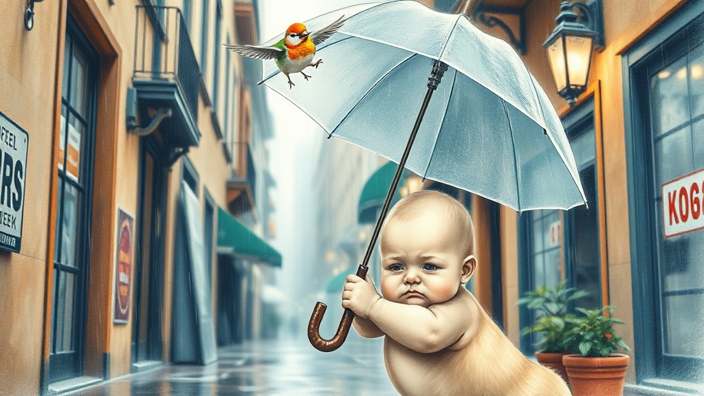 A charming and artistic depiction unfolds, showcasing a chubby yet adorable baby clutching an umbrella amidst a rain-drenched small alley of a bustling city. This scene artfully blends elements of beautiful colored pencil line art, highlighted by graceful curves and expert brush techniques. The baby, with cherubic features, is accompanied by a playful dog, creating an endearing and whimsical interaction. Above, emotional birds are perched, adding a lively touch with their melodious chirping, captured in an intricate line drawing style. The composition is a breathtaking masterpiece, rich in incredible detail and stunning rendering, evocative of trends seen on ArtStation. The ambiance is captured in lush 8k fine art photography, where realistic conceptual art meets perfect light and natural volumetric cinematography. Soft light and shadows play across the scene, reminiscent of acclaimed photography and oil on canvas techniques by masters like Raphael, Caravaggio, Greg Rutkowski, Beeple, Beksinski, and Giger, resulting in an award-winning example of creative storytelling and visual mastery.