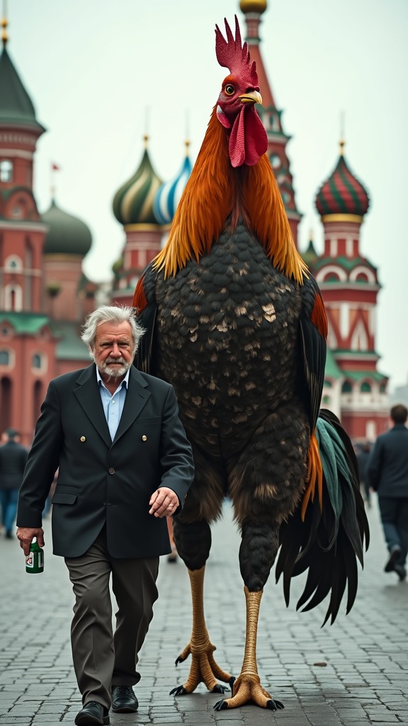A photo depicts a towering rooster, twice the height of an average human, striding confidently on two legs. The rooster is clad in a worn, patchwork suit that flutters with every step. Beside the colossal bird stands a middle-aged man in a rumpled, unkempt suit that once might have resembled presidential attire. The man's face is unshaven, and he clutches a bottle, giving off the air of someone who's fallen on hard times. Both figures are making their way purposefully toward the camera, highlighted against the iconic backdrop of Red Square with the colorful domes of St. Basil's Cathedral behind them. The striking contrast in size between the rooster and the man is accentuated, emphasizing the rooster's dominating presence.