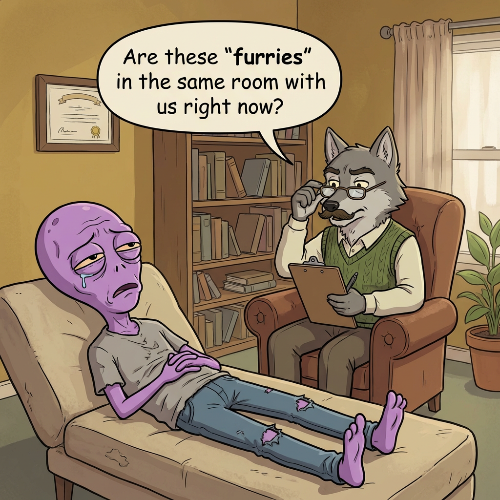 A depressed purple alien with droopy eyes and a sad expression, lying on a worn-out beige sofa, wearing a dirty grey t-shirt and ripped blue jeans. Across from him, a grey wolf therapist with a mustache, glasses, and a green sweater vest, sits in a brown armchair, holding a clipboard and pen. A speech bubble above the wolf reads: "Are these 'furries' in the same room with us right now?". The setting is a cozy therapist's office with a bookshelf filled with books and a framed diploma on the wall, a green plant in the corner. Cartoon art style, clear outlines, muted warm colors, soft lighting, and a slightly humorous, melancholic mood.