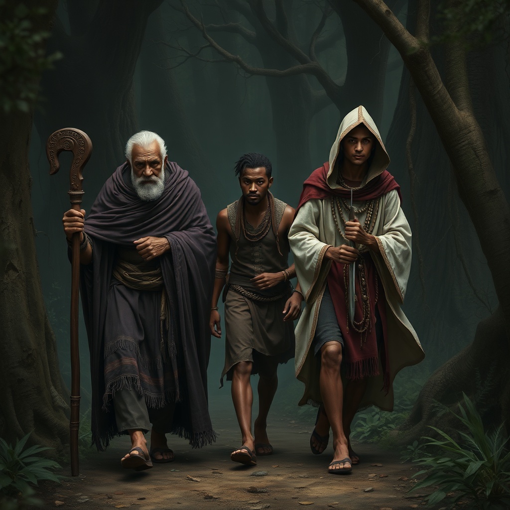 In the haunting depths of the Kelunwa Forest, the aged King trudges forward, his sunken eyes reflecting a life of burden and wisdom. His once vibrant royal cloak has faded to a muted purple, its edges frayed and worn, trailing behind him as he leans heavily on a staff intricately carved with the symbols of his ancestors. Beside him, Prince Chidi strides with purpose, his sharp jawline set with determination. Clad in a rugged leather tunic and a hunter’s cape that seem to merge with the forest itself, he grips a ceremonial sword that gleams faintly in the dim light. The Chief Priest accompanies them, his slender form draped in flowing robes of white and red that whisper as he moves, adorned with strings of beads and cowrie shells that chime with every step. His face is a canvas of sacred markings, only partially visible beneath the hood that shadows his features. The forest looms around them, ancient trees with skeletal branches reaching towards the obscured sky, swirling silver mist curling around their boughs. Shadows slither and morph through the dense undergrowth, revealing glimpses of glowing eyes from creatures hidden in the veil of darkness. At the heart of this foreboding scene, a cavern awaits, its entrance yawning like the maw of a monstrous beast. Dark and ominous, it breathes a faint red light that pulses rhythmically, casting an eerie glow upon the group as they stand poised at the threshold of its mystery.