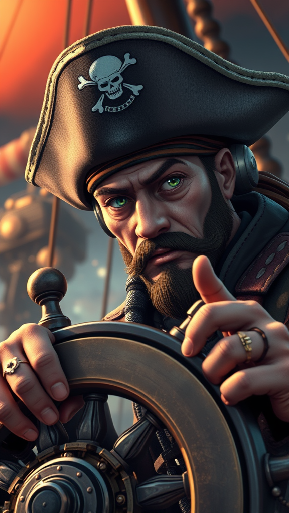 Describe a scene featuring a lone space pirate in the characteristic style of Sam Bosma. He wears a distinct Jolly Roger hat and commands a magnificent steampunk ship. The composition is cinematic, with dramatic lighting that highlights the high level of detail throughout. The pirate's intense gaze is captured, emphasizing his unique eyes—a slight imperfection in one iris and pupil creates an air of mystery. His hands grip the ship's wheel with an extra finger on one hand, hinting at his otherworldly adventures. Despite his imperfection, he exudes charisma and confidence, a testament to his adventurous spirit. The ship, with its elaborate gears and steam-powered mechanisms, looms behind him. The scene is visually stunning in 16k resolution with UHD and HDR qualities, bringing every detail to life. Although fantastically detailed, the focus remains on the pirate, steering his vessel through the cosmic expanse with unmatched determination.