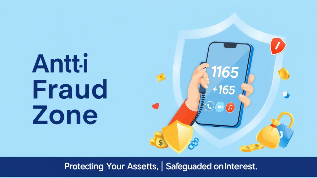 Design a banner for an anti-fraud zone using a light blue background, incorporating a transparent shield to symbolize safety. On the left side, feature a character on a phone call, with their hand representing a phone screen, displaying the anti-fraud hotline +165, alongside a shield icon and a call button. Next to the character, include elements such as a gold shield, a money bag, and a padlock. The main headline on the left reads "Anti-Fraud Zone," and the subheadline underneath states "Protecting Your Assets, Safeguarding Your Interests."