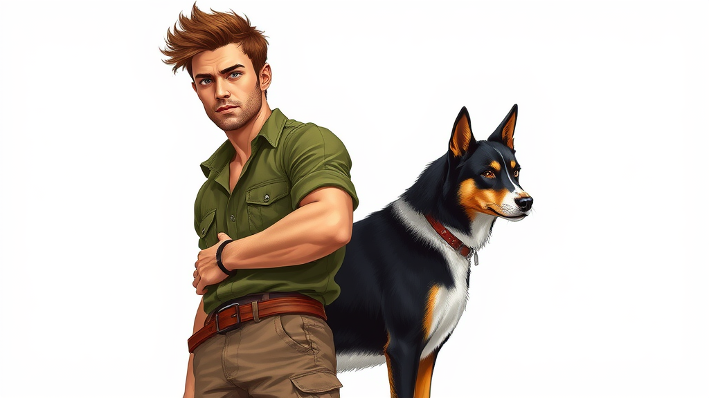 Design a captivating, realistic illustration for a men's phone case, featuring an athletic Australian man in his late 20s to early 30s. His sun-kissed, weathered skin and strong jawline, coupled with light stubble and piercing blue eyes, reflect his adventurous spirit. His short, wind-tousled hair with natural brown highlights adds to his rugged charm. Displaying calm strength, he wears an olive-green short-sleeve shirt with rolled-up sleeves, exposing muscular forearms, and weathered khaki cargo shorts with hints of dirt. His sturdy, worn boots are ideal for hiking, and a brown leather belt with a multi-tool and flashlight highlights his readiness for adventure. He stands tall, one hand resting on his loyal Australian Kelpie, the other hanging by his side, embodying strength and security. The sleek, agile Kelpie, with its glossy black and tan coat, bright eyes, and upright ears, mirrors the manβs ruggedness, leaning towards him in a stance full of energy and loyalty. The background is minimalistic with a pure white color, subtly suggesting the Australian outback's essence with hints of red earth and distant silhouettes. Warm, natural lighting enhances features, using earthy tones like deep greens, browns, and sandy yellows to highlight clothing textures and the dog's fur. This design conveys adventure, strength, and the unbreakable bond between man and dog, appealing to outdoor enthusiasts and lovers of the rugged Australian lifestyle. Perfect for a phone case, it captivates with its unique adventure-driven vibe and spirit of companionship.