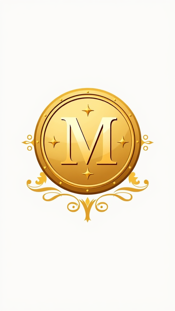 Design a classic logo featuring the letter M at the center of a coin, using a golden color palette with gentle gradients, set against a plain white backdrop. Add artistic details and vintage embellishments to give it a timeless and elegant feel.