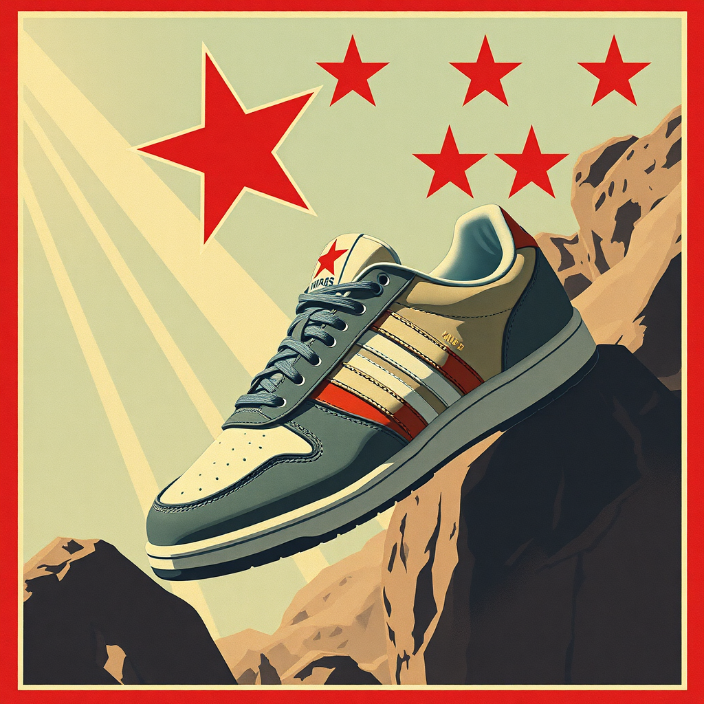 Design a compelling sneaker in a vintage Soviet-style poster, blending elements of classic USSR propaganda aesthetics with a touch of anime influence. The artwork should feature high-detail, offset printing techniques in stunning 8K HD resolution with CMYK coloring. Capture a joyful vibe with natural lighting, creating an engaging and nostalgic atmosphere. The aspect ratio is 2:3, ensuring a striking and balanced composition that draws viewers in.
