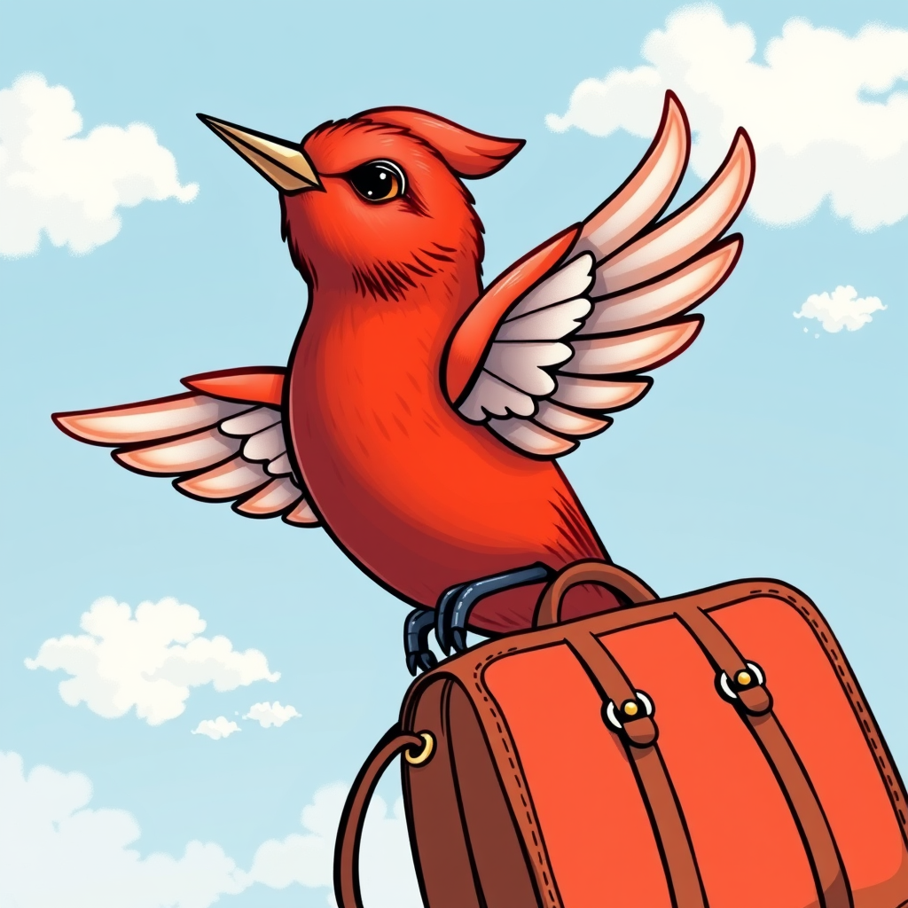 Design a logo for a travel website featuring a vibrant red bird with elegant, slightly iridescent white wings clutching a vintage-style travel bag. The background illustrates a serene blue sky peppered with soft, fluffy white clouds. The artwork draws inspiration from the delicate, intricate style of Beatrix Potter with a charming cottage core aesthetic, capturing a sense of nostalgia and whimsy. This logo should be depicted in stunning 8K resolution, showcasing highly detailed elements from a 45-degree angle to add dimension and depth.