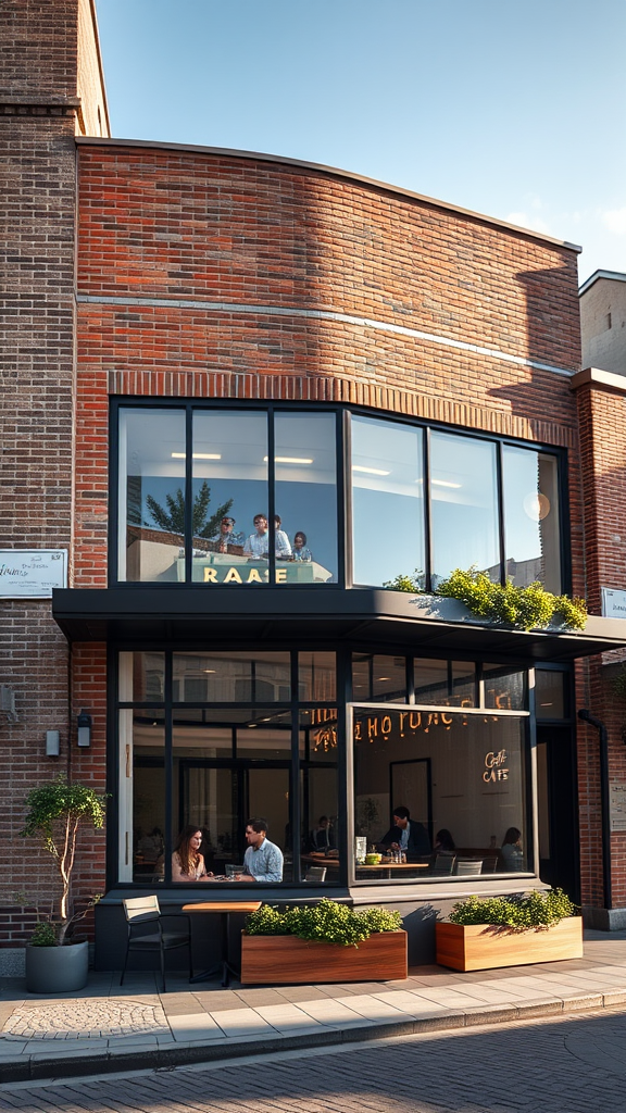 Design a modern and minimalist cafe facade featuring a striking juxtaposition of weathered bricks and expansive glass windows, seamlessly blending historical and contemporary architecture. Capture a high-quality shot with a Canon EOS R5 using a 50mm f/1.2 lens, under the soft, natural light of a clear afternoon sky, illuminating the clean lines and minimalist design elements. The ultra-realistic 16K resolution image should reveal intricate details, with a few patrons inside enjoying the sophisticated ambiance, all while ensuring the view remains unobstructed by cars or pedestrians, allowing the architectural beauty to take center stage. To add a unique touch, incorporate subtle greenery, such as elegant planter boxes or climbing vines, enhancing the harmonious balance between natural elements and modern design without detracting from the minimalist aesthetic.