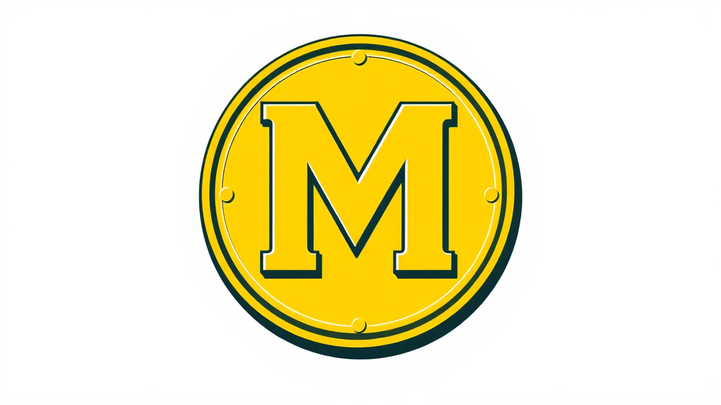 Design a retro-inspired emblem featuring the letter M prominently displayed on a coin, utilizing a yellow color palette with understated gradients and set against a white background, incorporating subtle artistic touches to enhance its iconic appeal.