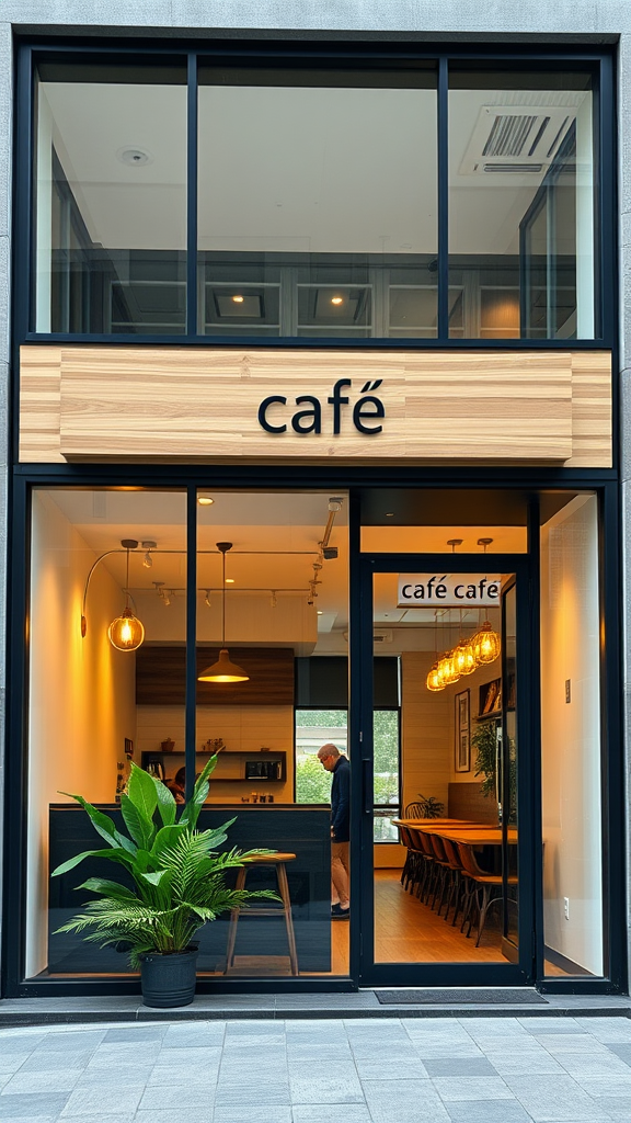 Design a sleek and minimalist cafe facade with large floor-to-ceiling glass windows that blur the boundary between interior and exterior, finished with a subtle matte black frame that adds a contemporary edge. Incorporate a clean, horizontal wooden panel above the entrance, displaying the cafe's name in understated, sans-serif typography. Add a few strategically placed, lush green plants near the entrance to infuse a touch of nature and enhance the modern aesthetic. Utilize soft, warm lighting from pendant fixtures to create an inviting glow, contrasting with the facade’s minimalist design while maintaining its serene elegance.