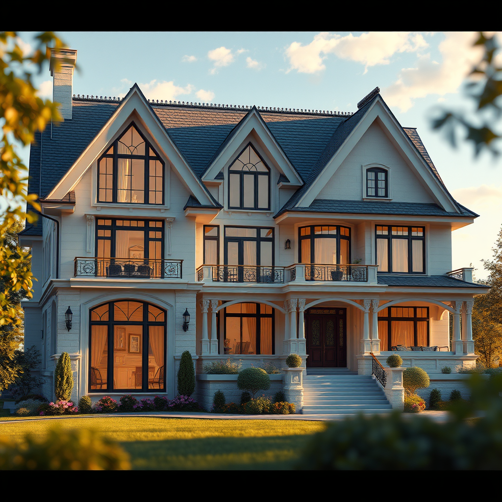 Design an architectural drawing of a dream home featuring a photorealistic and cinematic composition with high detail and ultra-realistic elements. The scene is lit with cinematic lighting, capturing a depth of field that enhances the hyper-detailed contours of the structure. The color palette is beautifully coded to complement the sunny day setting, and every facet of the design is captured in stunning 8k resolution. Include many intricate details within the architecture, while making small creative modifications such as unique window designs and innovative roof shapes that still align with the overall concept.